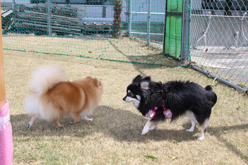 →既に他の犬がいる場合は、ゲートを通る前に柵の手前で待機します。たいてい自分のワンちゃんに気づき、近寄ってきます。ネット越しに犬同士を合わせて、ワンちゃん同士が興奮しないことを確認します。どちらかの犬が興奮して吠える、または攻撃するような行動を見せたら、犬が落ち着くまで待ったほうがよいです。他のスペースにワンちゃんがいない場合は、小型犬でも大型犬のスペースを使っていただいて問題ありません。